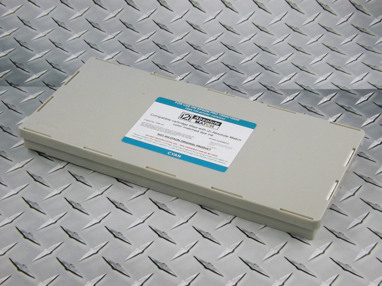 Single use 500 ml cartridge for the Epson Pro 10000/10600 filled with Absolute Match ABE1 color dye inks. Color matched to the original Epson dye inks and supplied in a cartridge with a dye chip installed. For use in the cyan cartridge slot only.