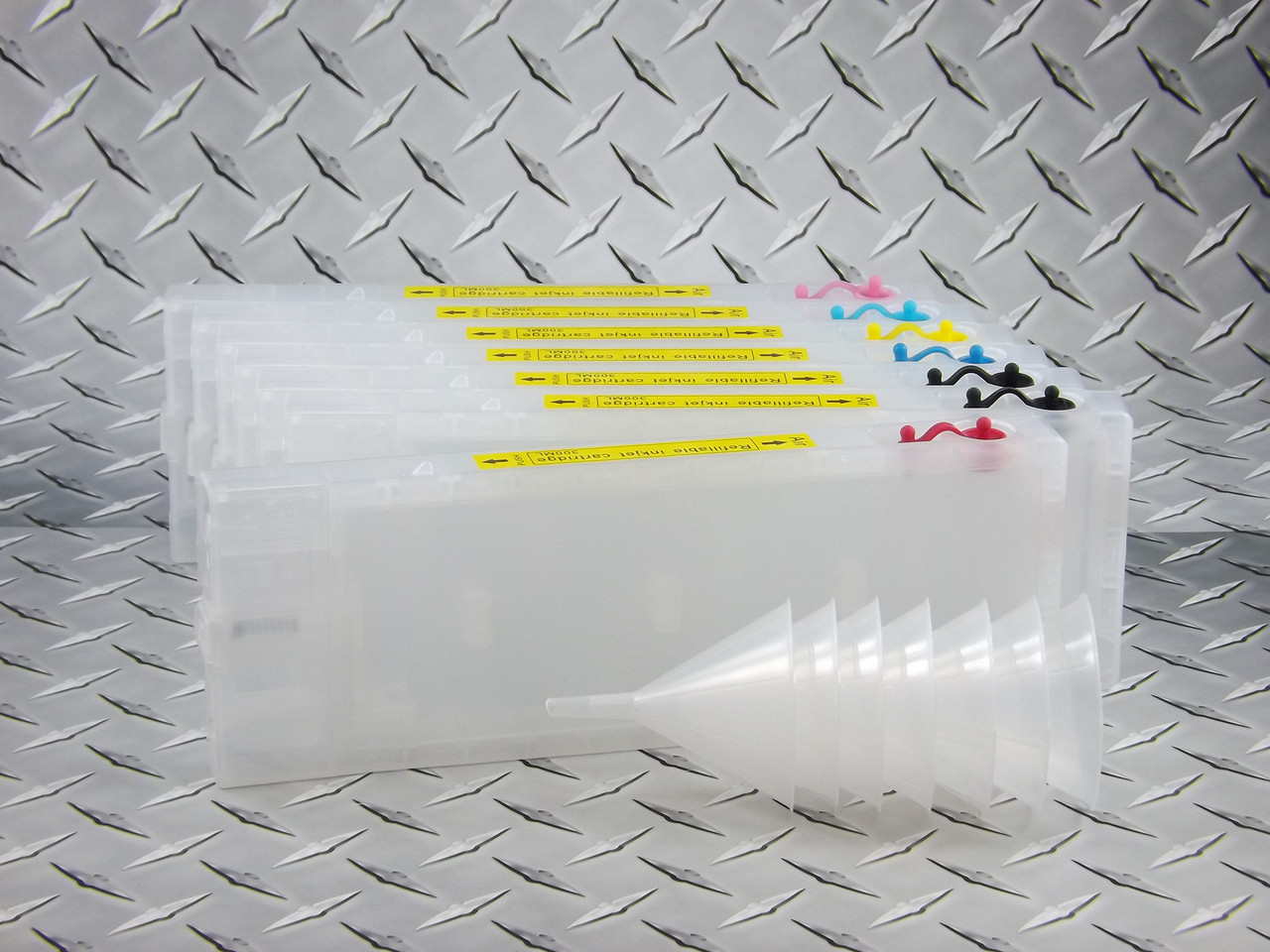 Refillable Cartridge set for the Epson Pro 7600/9600 - 7 x refillable cartridges, 7 x funnels, and instructions - empty, no inks included. Black cartridge has Photo Black chip installed.