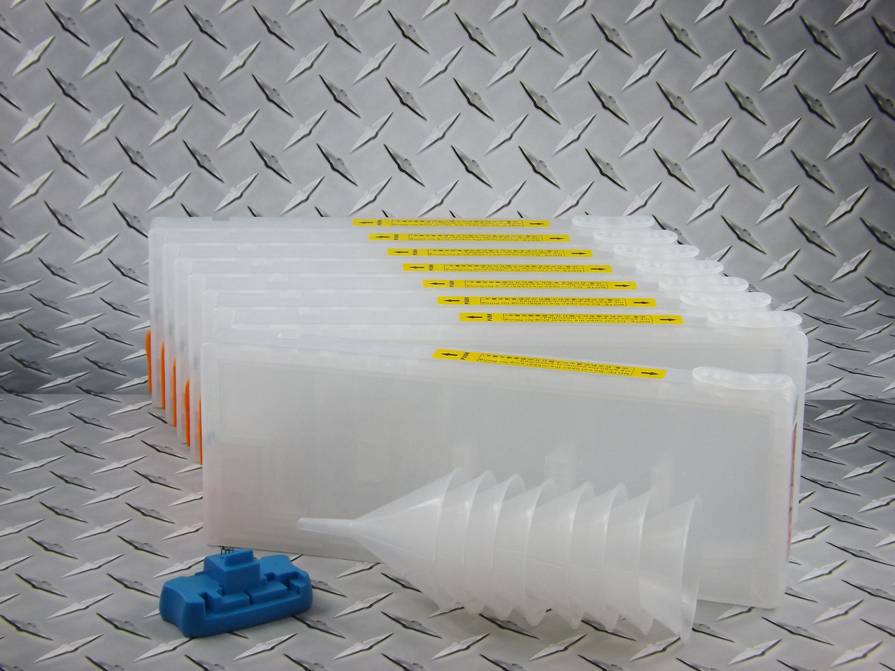 Refillable Cartridge set for the Epson Pro 7800/9800 - 8 x refillable cartridges, 8 x funnels, chip resetter, and instructions - empty, no inks included. Black cartridge has Photo Black chip installed.